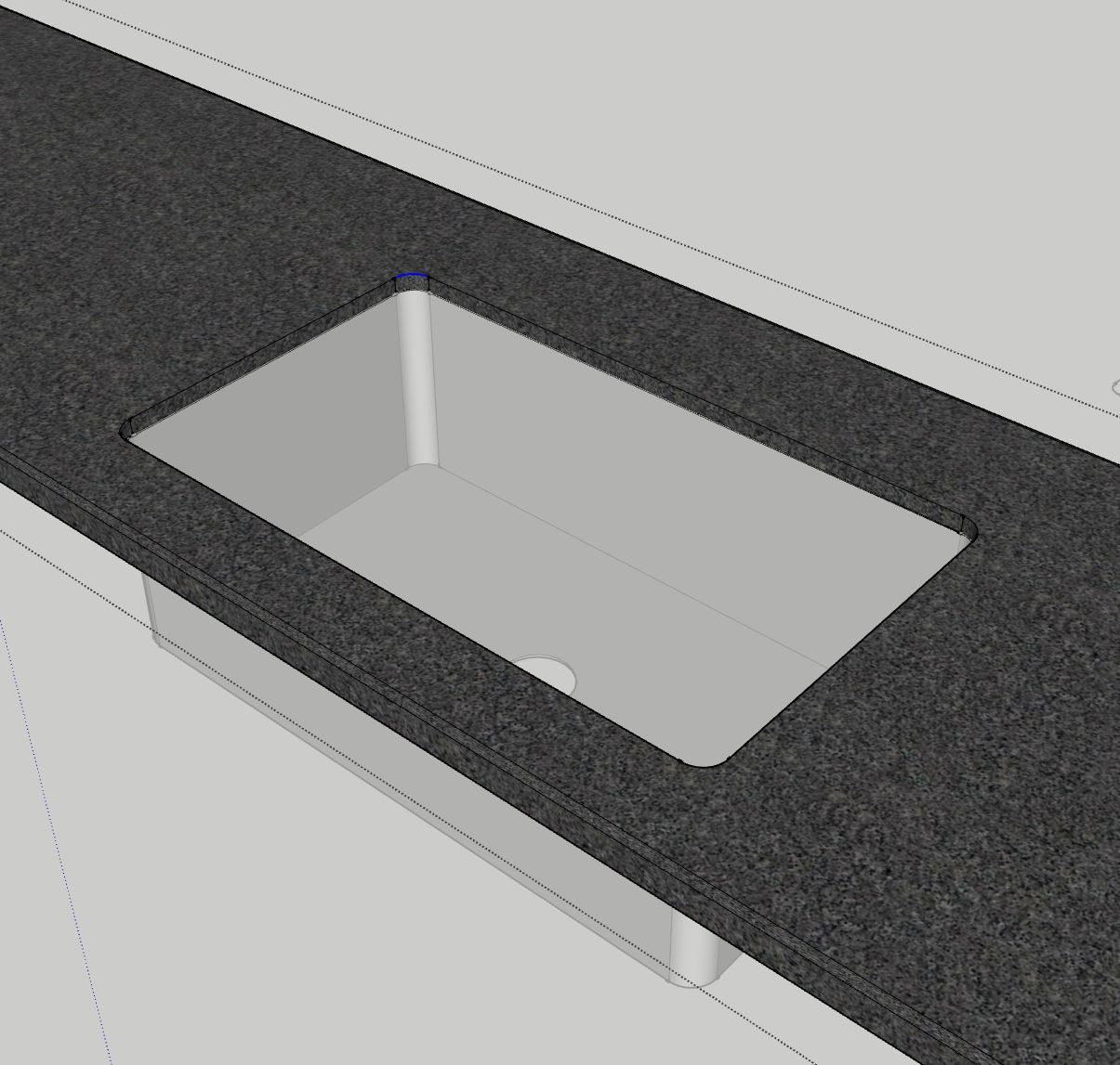 After I copied the countertopās cutout edge lines, I pasted it onto a surface, then trimmed away everything outside of the copied lines. I then Push-Pulled the remaining surface up around 10", making the solid. Then I offset the solidās top surface curves inward 1/8". Then I Push-Pulled that inner surface downward into the solid to make the sink hollow. The last step was to Push-Pull the garbage disposal hole at the bottom of the sink.