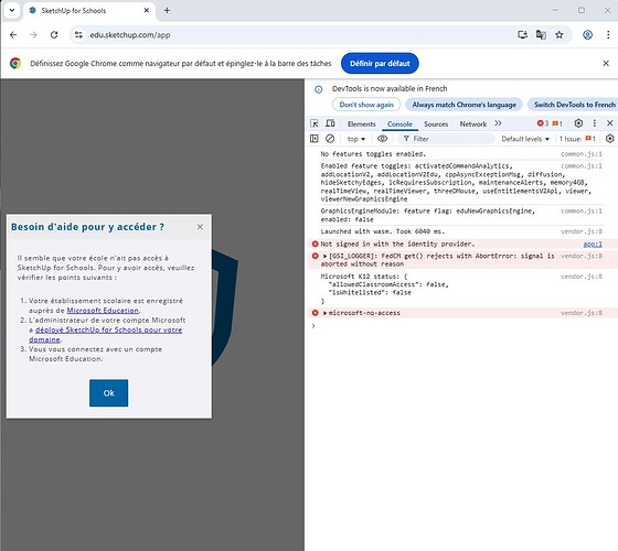 Hi @chrcarre , thanks for reaching out and sorry to hear that you lost access to SketchUp for Schools. While I am happy to work with you to try and figure out what went wrong, Microsoft accounts should not be affected by our database system as they use a different system for verification. If you have a moment, can you grab a screenshot of any errors you are getting when you try and access the app? I may be able to figure out what is wrong based on that. Bonus points if you can get a screenshot of the developer mode console in the browser you are using to access SketchUp for Schools as that tells me even more.