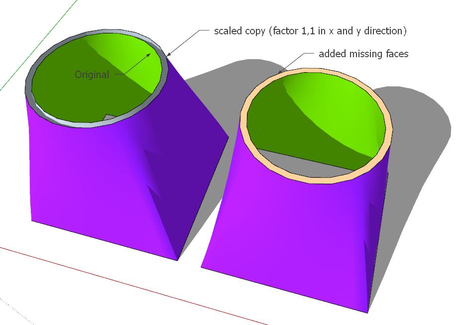 I would like to 3d print a transition coupling from a square opening to a round opening. I have successfully drawn it but I now need to add depth for the walls. I can extrude the flat sections but not the curved sections. Any suggestions??