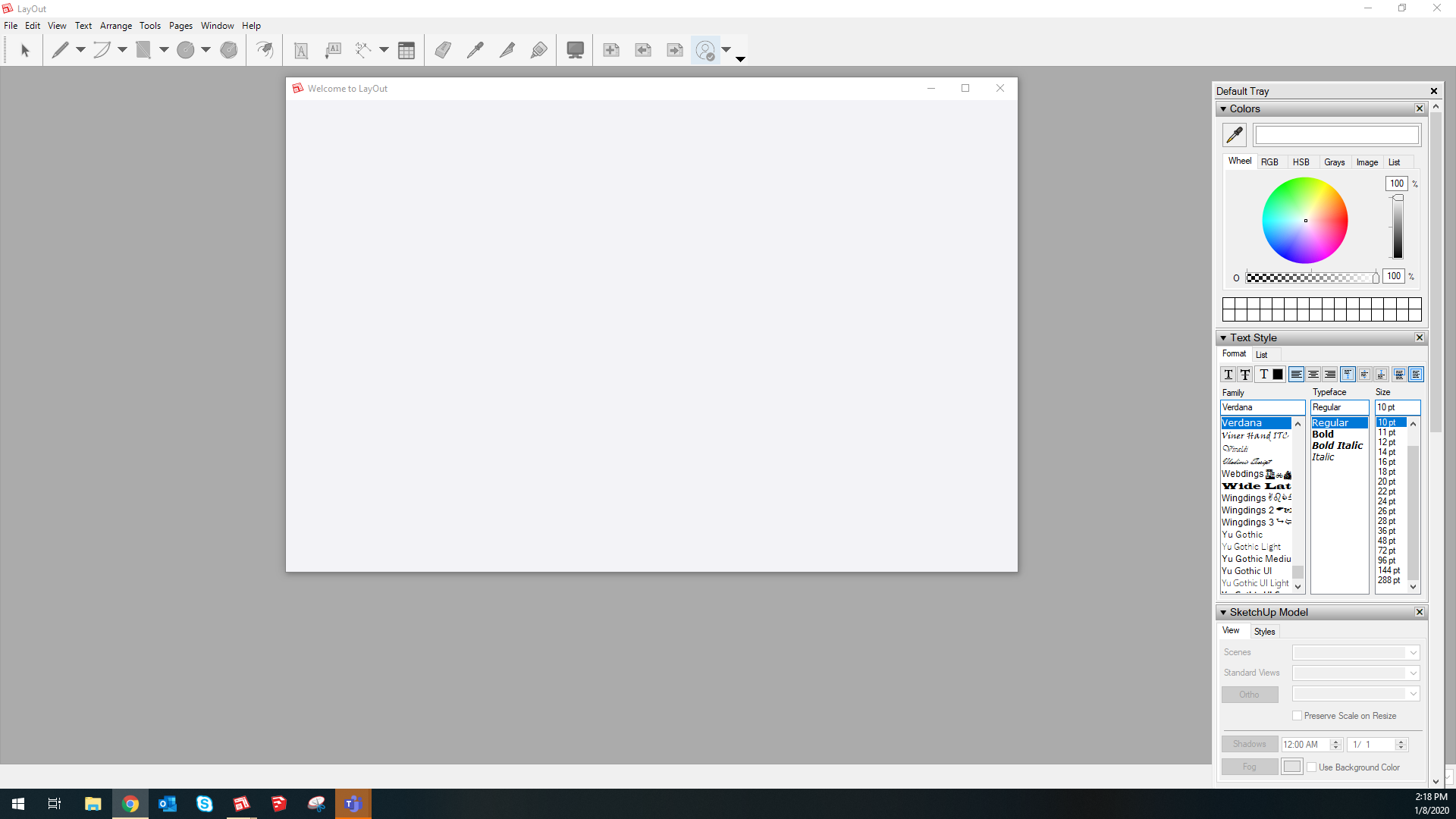 Pretty self explanatory. Layout isn’t opening on my computer, and hasn’t opened for a week or so. Sketchup is completely fine, just Layout. Before these difficulties started, Layout used to open basically instantly on my computer (as quick as opening microsoft word). I’ve been using it on my computer for about a year with absolutely no difficulties whatsoever until it just stopped opening all together one day. I’ve tried waiting for it to open (left the computer on its own for 4hrs+) getting into Layout via opening previous Layout documents I’ve created, using the “send to layout” feature in Sketchup, restarting my computer and trying all of these over again. Nothing. Here is a screen grab for what my desktop looks like when I attempt to open Layout. Layout will look like this on my desktop for hours, with no ability to interact with the software until I force close the application.