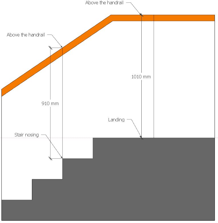Height 910mm from the stair nosing above the ramp and 1010mm from the landing above the ramp.