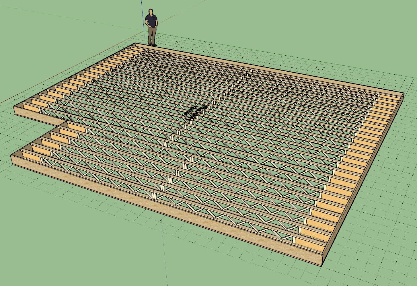 This new algorithm (only devised two days ago and further perfected last night) first finds all of the locations and sizes and then creates a new truss/joist for each new size encountered, reusing the sizes that have already been drawn as necessary (so as to eliminate extra calculations and processing). So no trimming or subtracting required but a slightly more complex system for determining what actually needs to be drawn. There may be a few flaws with it, only time will tell, it is too new to know if it is as fully robust as it needs to be, but I will continue to test it and try and break it.