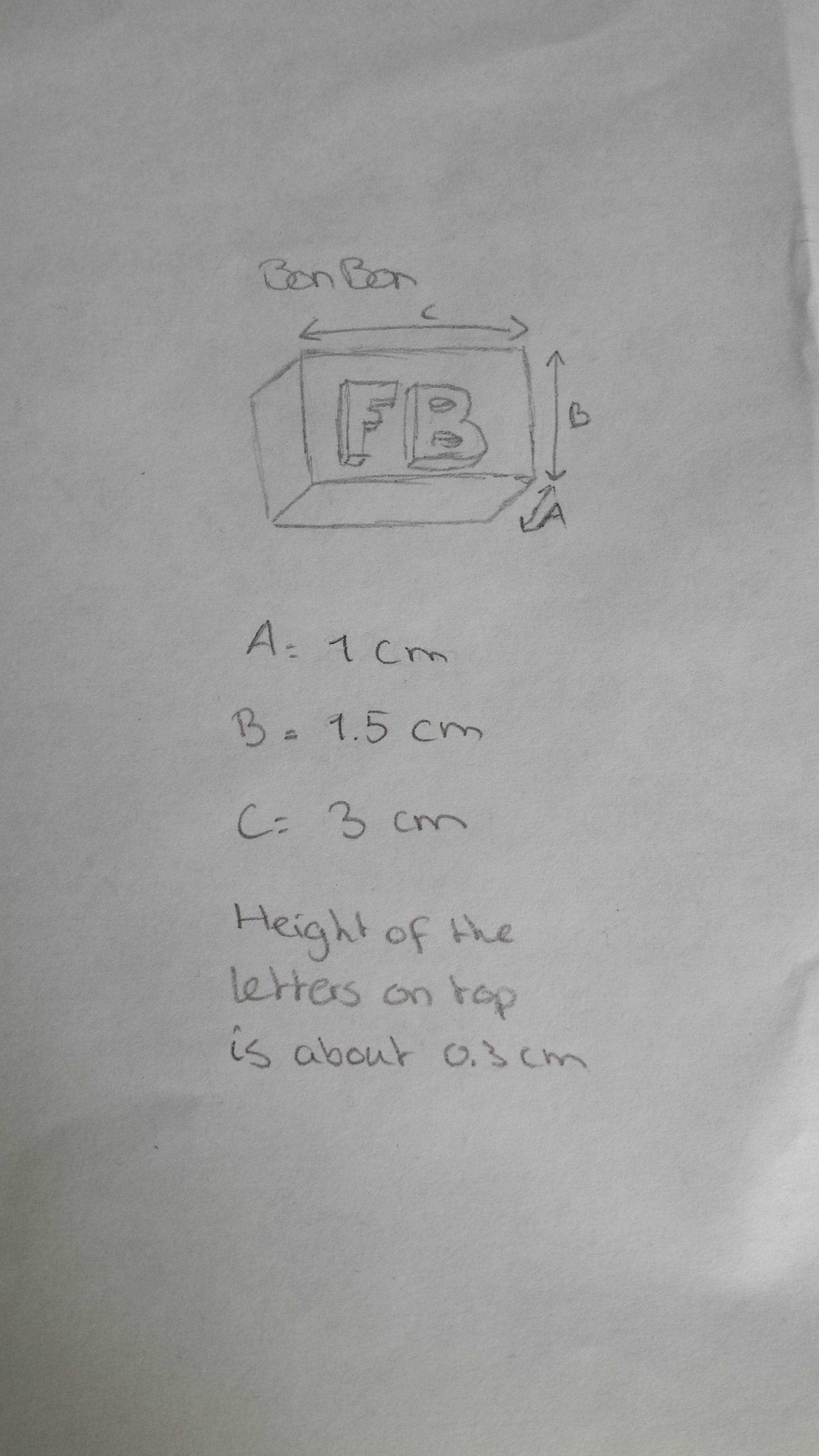 Model 1: the size of a bonbon (roughly 3cm x 1,5 cm) with ‘F&B’ on top