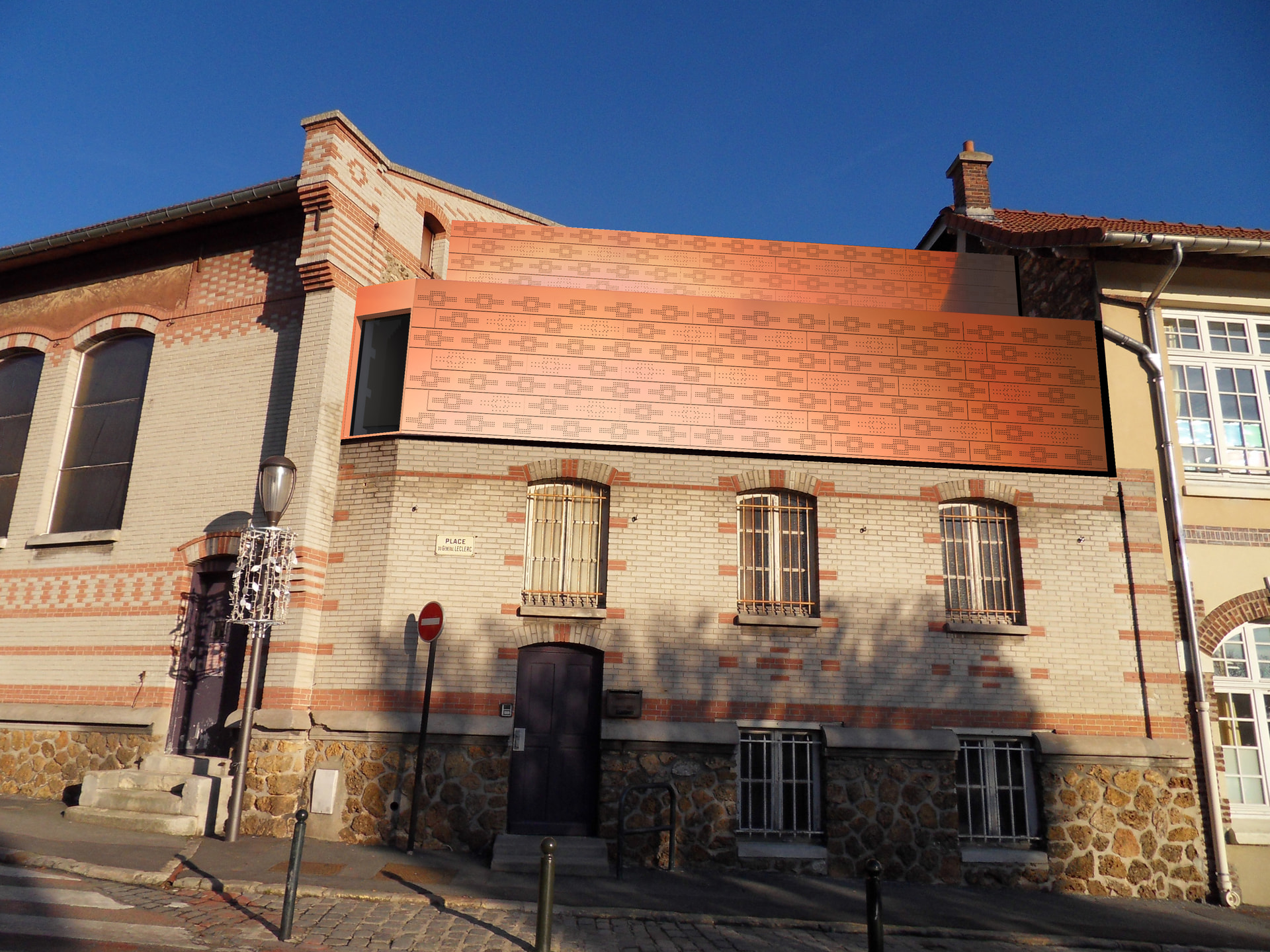 extension footprint, using perforated metal for the exterior; inspired by existing brick patterns.