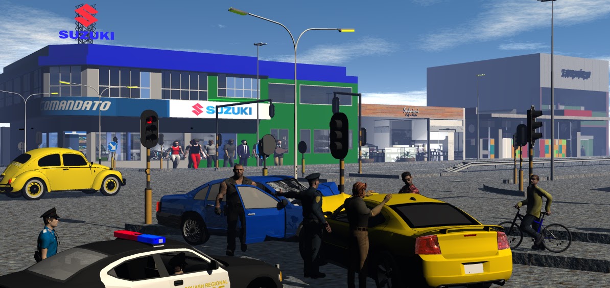 SketchUp Models - buildings, cars, road. Characters created in Xnalara. Animation with Paint Shop Pro’s Animation Shop. Rendered in Bryce 7.1