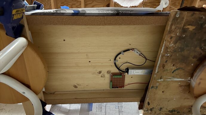 This post covers two days. Yesterday, I finalized attaching ALL the electrical components below the base. What’s left will be the very last task performed, after the case is built and mounted, when I turn it on its side and attach all the field LED leads to the circuit board. It’s AFTER the case is on to protect turning the model on its side.