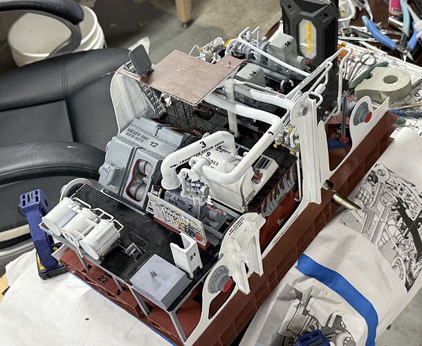 Back in the shop for a short session, I added some horsepower decals to the model. Having the RPM numbers without the horsepower numbers seemed incomplete. I also added the latest RPM decal to the repainted MRG top.