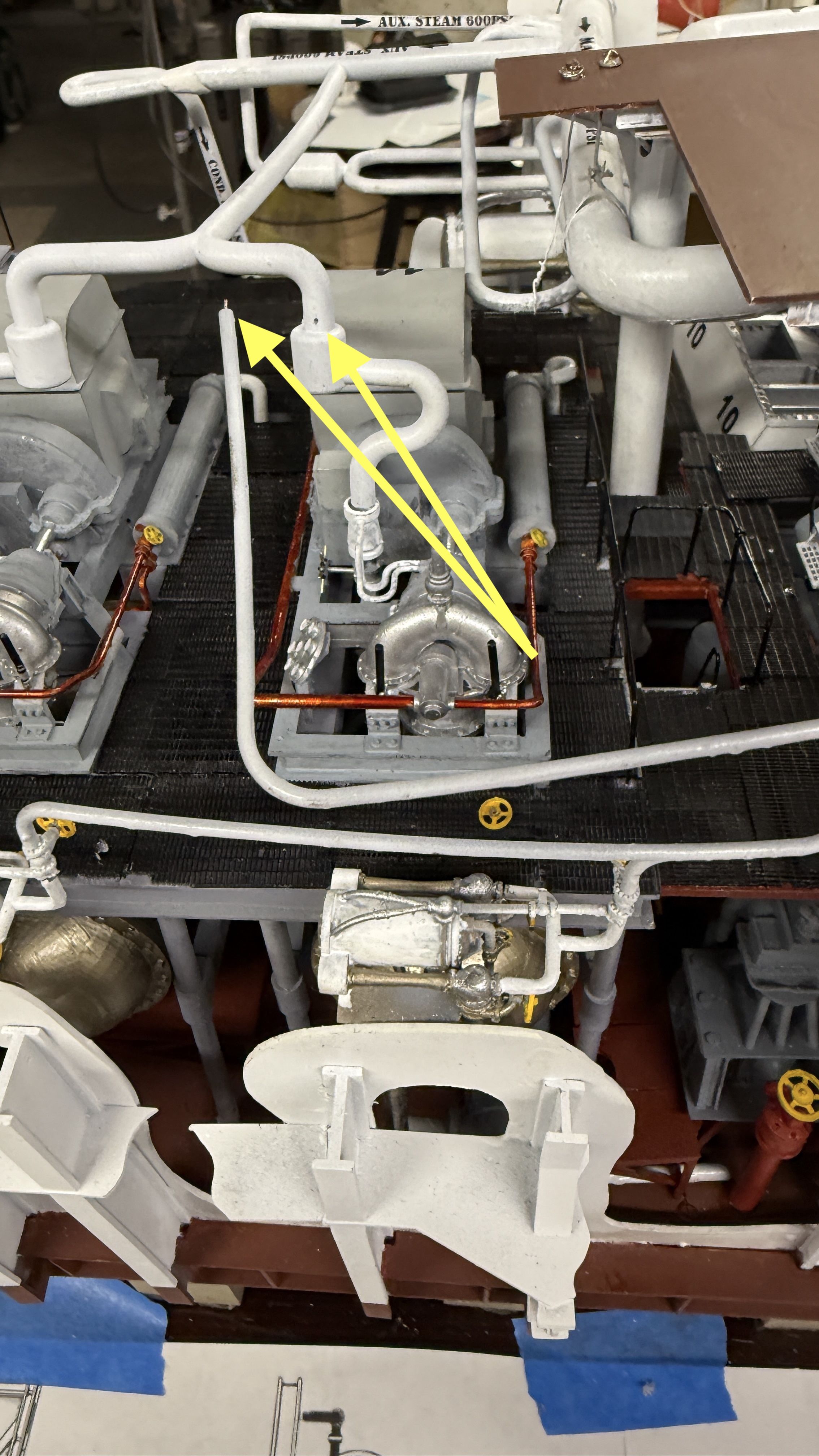 Tto install the aux AEs, I had one more pipe to connect. I had pre-pinned the pipe end and drilled an appropriate hole in the aux steam header.